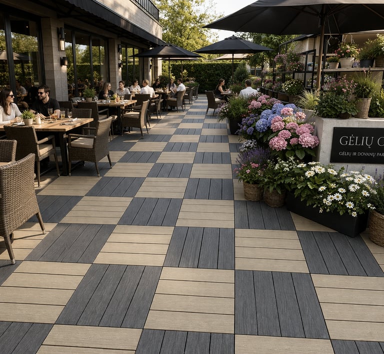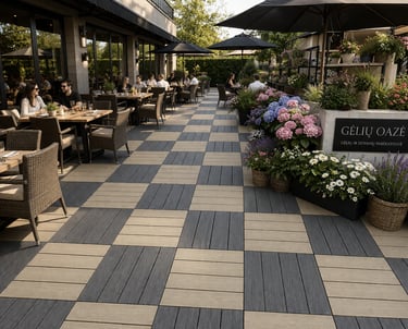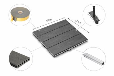 Modernus, modulinis sprendimas greitam ir estetiškam lauko erdvių įrengimui. WPC (medžio–plastiko kompozito) plytelės 57×57 cm sukurtos intensyviam naudojimui – nuo laikinų instaliacijų iki ilgalaikių komercinių terasų.